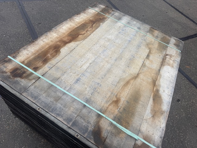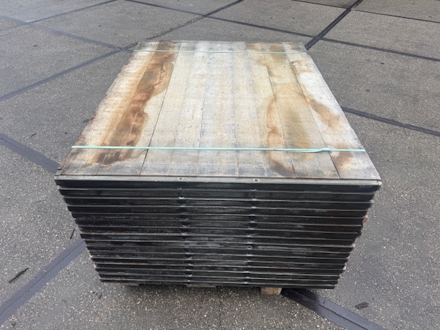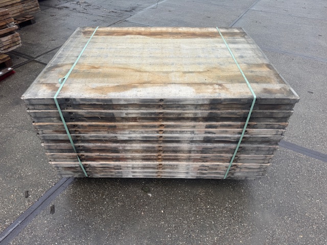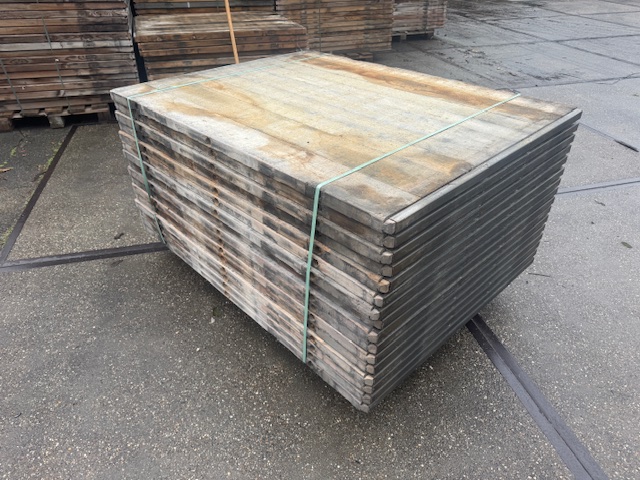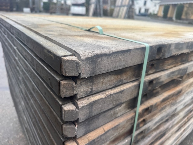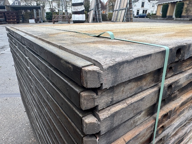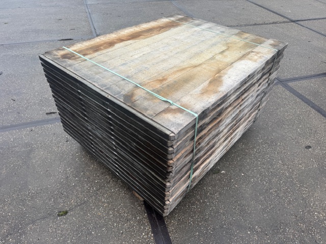Steenschotten van hardhout zijn robuuste, zware houten panelen die oorspronkelijk uit steenfabrieken komen. Ze werden gebruikt om versgebakken stenen op te laten drogen en af te koelen, waardoor ze een kenmerkende verweerde look krijgen door de hitte en druk.Deze schotten bestaan uit meerdere hardhouten regels (meestal tropisch hardhout zoals Azobé of Ekki, duurzaamheidsklasse 1), die met mes-en-groefverbindingen (pen-groef) aan elkaar zitten. Ze worden stevig bijeengehouden met ijzeren houtdraadbouten (draadeinden) en vaak verstevigd met metalen C-profielen aan de kopse kanten.Kenmerken van hardhouten steenschotten