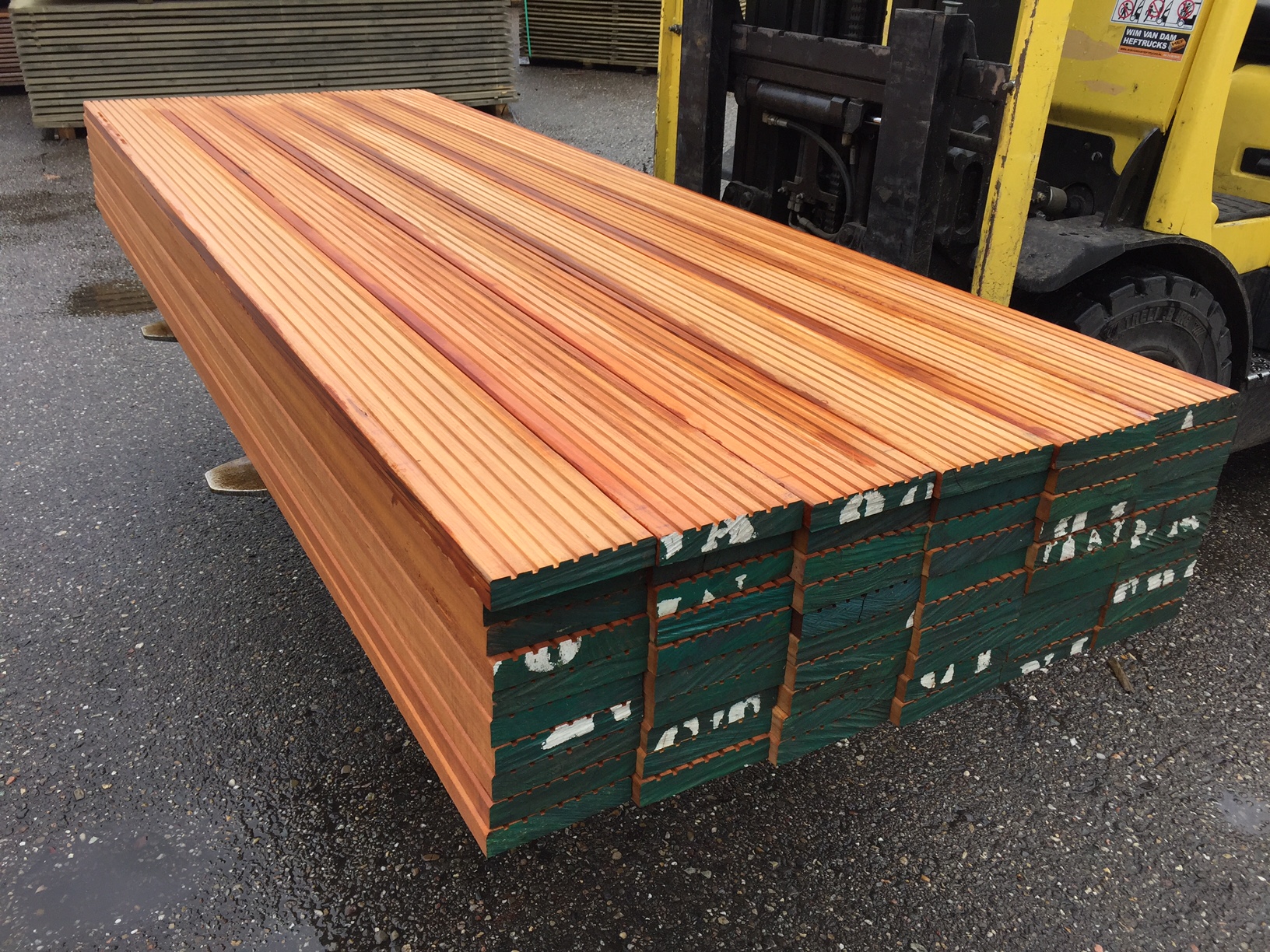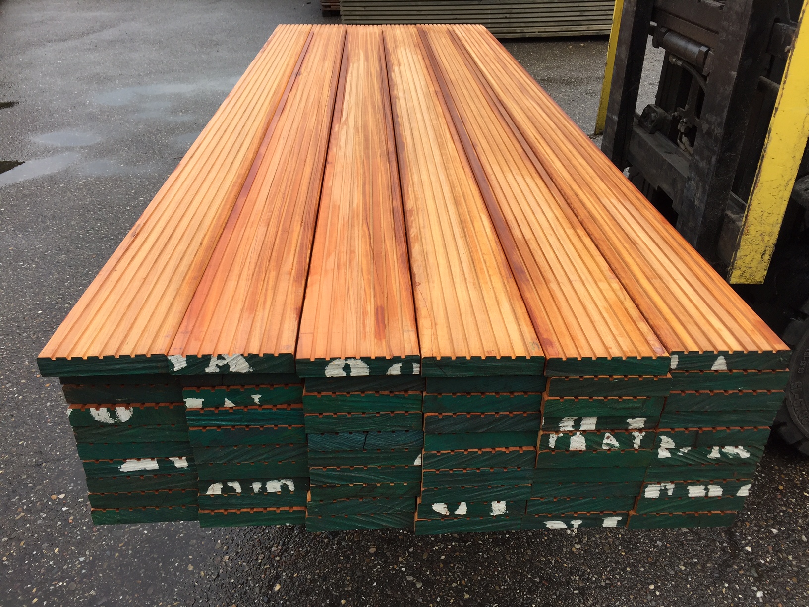 - Kleur: Versgezaagd oranjebruin kernhout, dat nadoorend naar licht roodbruin tot donker roodbruin. Soms met donkerdere strepen op kwartiers gezaagd hout. Er is een duidelijke overgangszone (licht oranje-geel) tussen sapwood en kernhout. Het sapwood is licht en breder (vaak 80-100 mm).